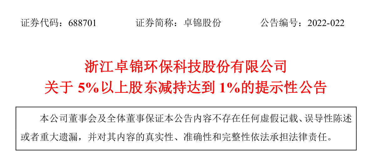 浙江卓錦環保科技股份有限公司關于5%以上股東減持超過1%的提示性公告