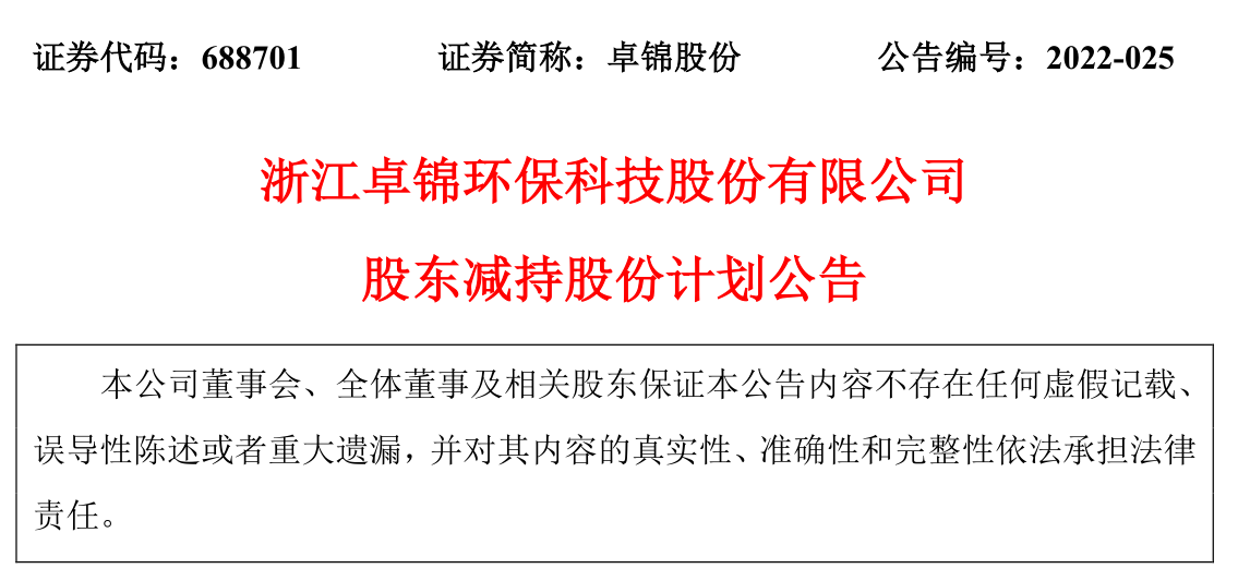 浙江卓錦環(huán)保科技股份有限公司股東減持計劃公告