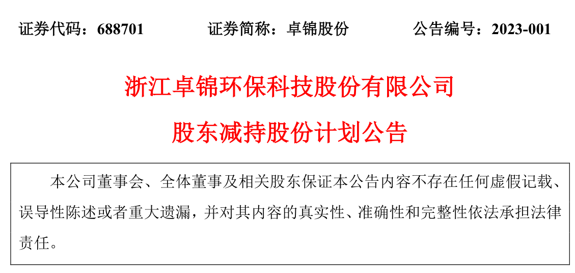 浙江卓錦環(huán)保科技股份有限公司股東減持計(jì)劃公告