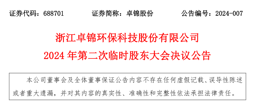 浙江卓錦環保科技股份有限公司2024年第二次臨時股東大會決議公告