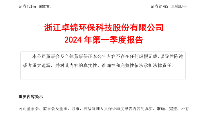 浙江卓錦環(huán)保科技股份有限公司2024年第一季度報(bào)告