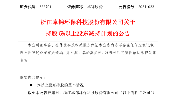 浙江卓錦環保科技股份有限公司關于持股5%以上股東減持計劃的公告