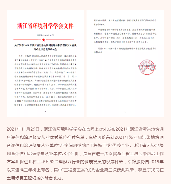 高度認可|卓錦股份獲評2021年浙江省污染地塊調查評估和治理修復從業單位“方案編制類”和“工程施工類”優秀企業